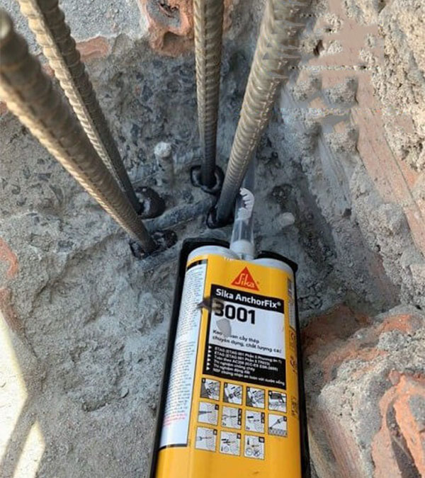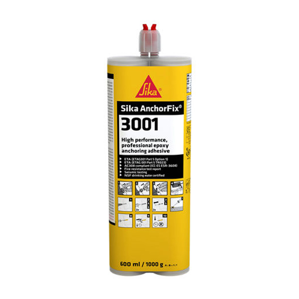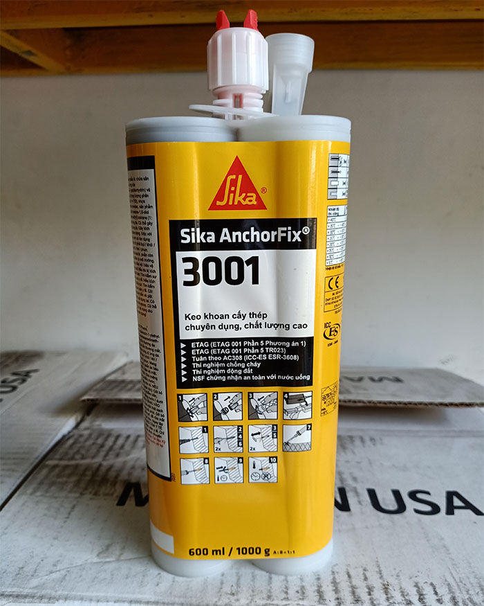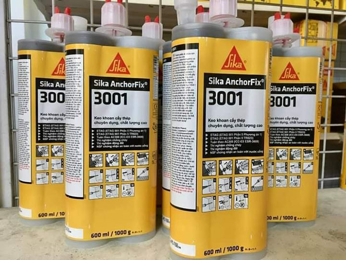 Sika Anchorfix 3001 là một loại keo khoan cấy thép chuyên dụng, có chất lượng cao và là sản phẩm neo thép chuyên dụng hai thành phần, gốc epoxy, không dung môi, có tính chất xúc biến. Nó được ứng dụng để neo thép có ren và thép chịu lực trong các cấu kiện bê tông, bao gồm cả những cấu kiện bị nứt và không bị nứt.