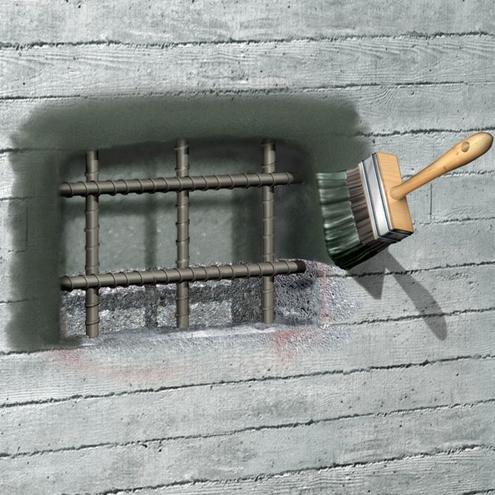- Dùng chổi quét hoặc thiết bị phun thích hợp để thi công lớp đầu tiên lên toàn bộ bề mặt bên ngoài của thanh cốt thép với độ dày khoảng 1 mm. Sau khi lớp phủ đầu tiên khô cứng, kiểm tra bằng móng tay, thi công tiếp lớp thứ hai với độ dày tương tự. Nếu sử dụng phương pháp phun, tránh phun quá mức lên bề mặt. Đợi vật liệu khô hoàn toàn trước khi thi công vữa sửa chữa.