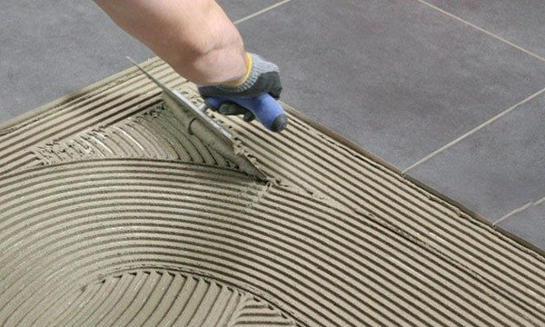 - Dùng bay răng cưa để trải đều keo lên bề mặt. Để tăng độ kết dính, phết thêm keo lên mặt sau của viên gạch.