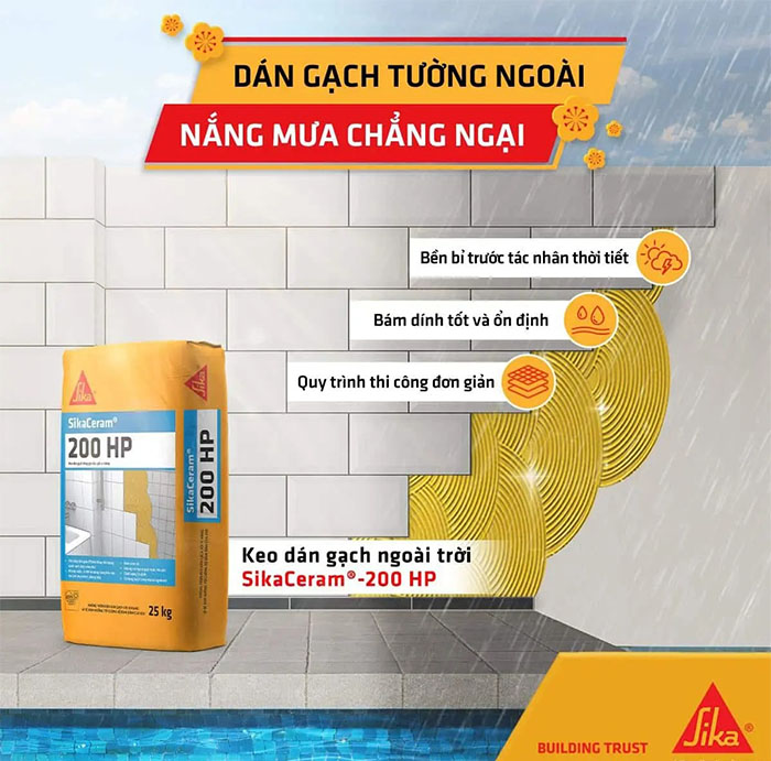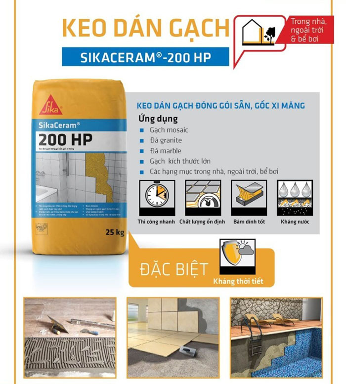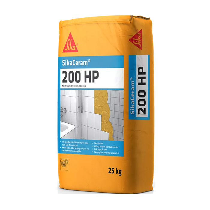 SikaCeram 200 HP là loại keo dán gạch gốc xi măng có tính năng chống thấm nước, được thiết kế đặc biệt để dán gạch trên các bề mặt như sàn, tường của bê tông, nền vữa và các công trình trong và ngoài nhà. Sản phẩm này phù hợp cho việc dán các loại gạch men, gạch đồng nhất, mosaic và cả đá granite, đá marble.