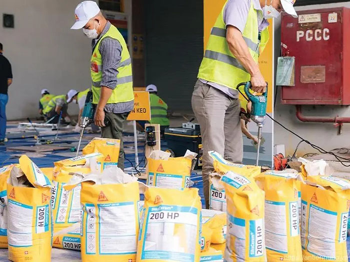 - Đổ bột SikaCeram 200 HP (1 bao 25 kg) vào thùng chứa có 5.5 – 6.5 L nước sạch.