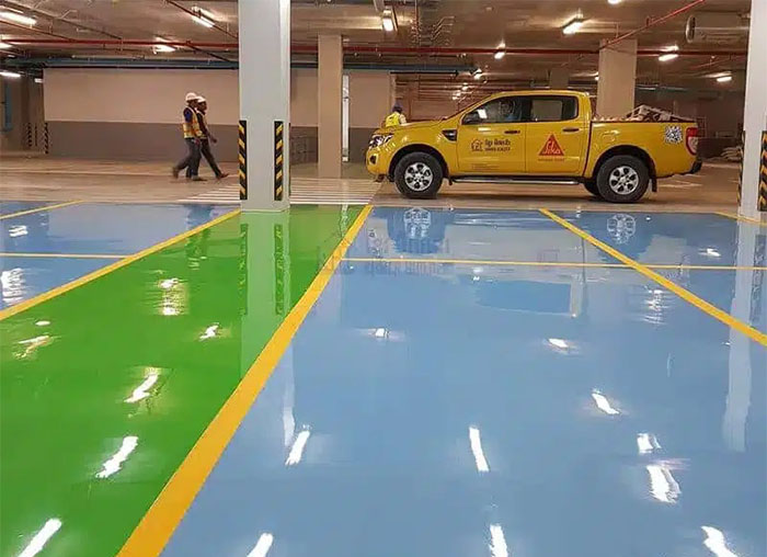 - Hệ thống sàn tự san phẳng: Thích hợp cho sàn bê tông và vữa cán nền chịu tải trọng từ thấp đến cao như kho bãi, hội trường, nhà xưởng, khu vực sửa chữa, bảo dưỡng, gara, và ram dốc.