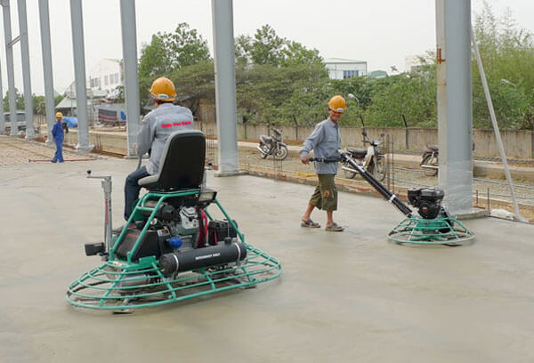 - Khi hỗn hợp bắt đầu tạo dạng nhớt hoặc sắp ninh kết, tiến hành san phẳng sớm bằng máy xoa nền chạy với tốc độ thấp, có lưỡi kim loại với độ nghiêng tối thiểu. Nếu cần, lần xoa mặt cuối cùng nên thực hiện sau một khoảng thời gian nhất định, với máy xoa nền chạy với tốc độ cao.